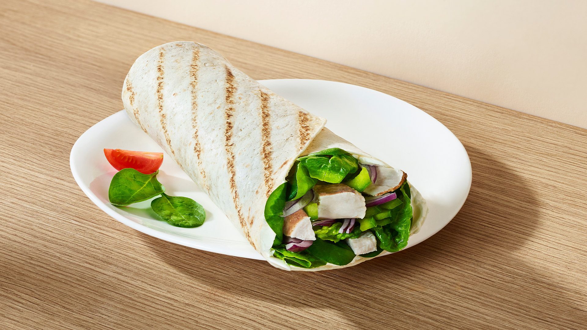 Juicy chicken in a soft tortilla with crispy lettuce, red onion, spinach and bell pepper.