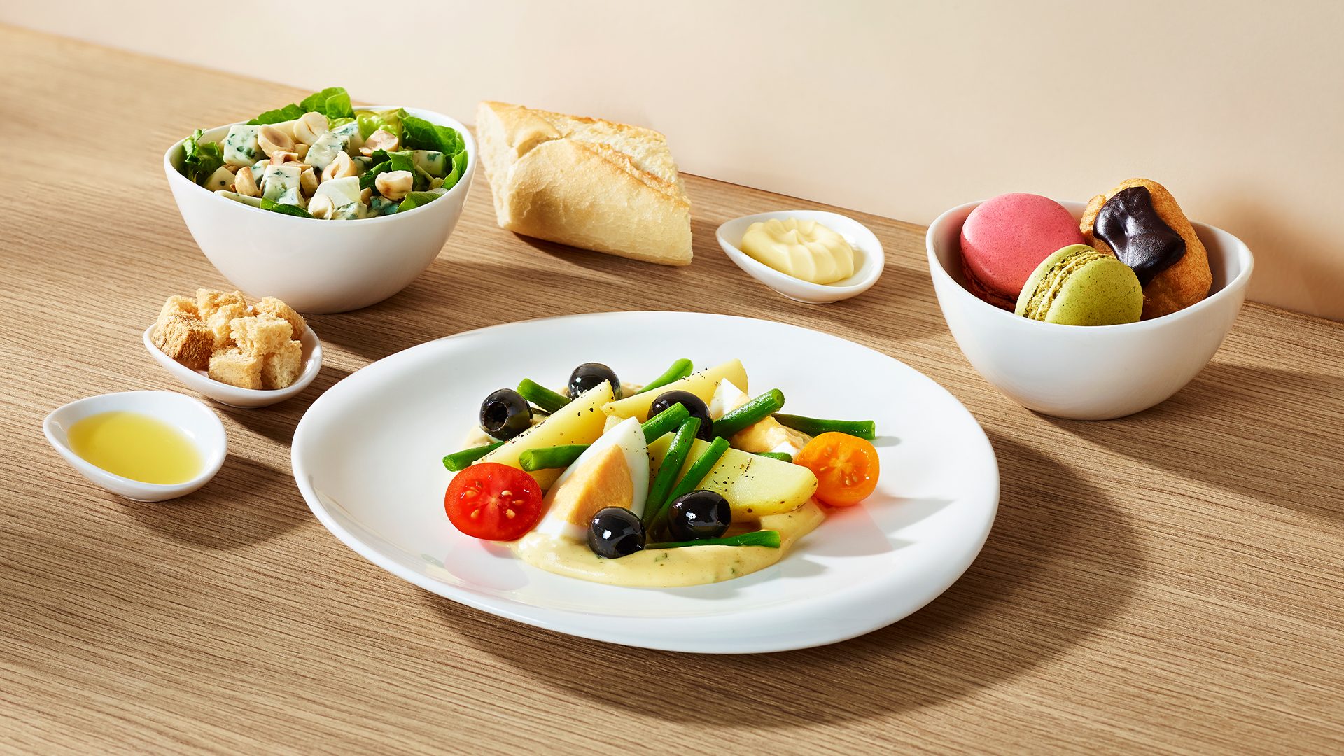 Niçoise salad with boiled eggs, baby potatoes, beans, black olives and cherry tomatoes, served with Dijon mayonnaise with tarragon. Served with romaine lettuce, chicory, Lazur blue cheese, roasted hazelnuts and croutons. Sweet treat – two macaroons and a mini éclair. Served with fresh baguette, butter and extra virgin olive oil.