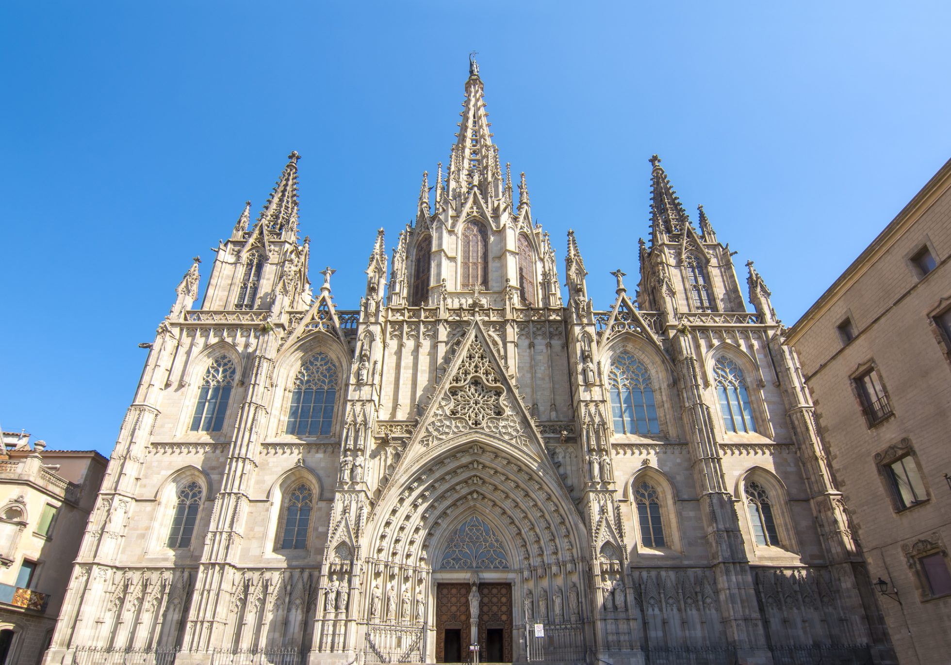 Fasada neogotycka katedry w sercu Barcelony zachwyca.