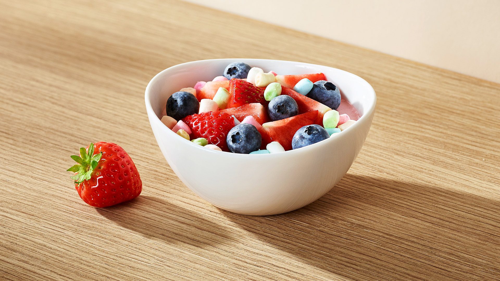 Нежный клубничный мусс с цветным маршмеллоу, свежими ягодами клубники и сочной черникой.